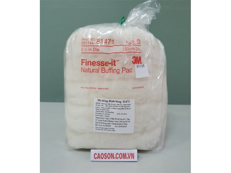 - Bánh lông cừu 3M Finesse-it 81471 được làm từ miếng da cứu còn dính các sợi lông cừu cắt ngắn thành 20mm để tạo nên độ thô ráp cần thiết khi sử dụng. Da tự nhiên sẽ giữ các sớ sợi và hạn chế chúng rớt ra. Do mật độ lông dày nên dung dịch đánh bóng được giữ lại và được phân bố ra khắp bề mặt xử lý nhưng vẫn hạn chế việc dung dịch đánh bóng bị rớt ra hay phân bố không đều.